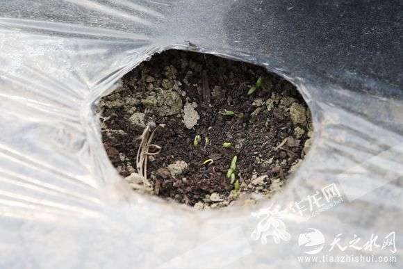 “快看,绿芽开始冒头了。”见我们来,马兹梅拍拍身上的土,抬头招呼一声。我蹲下身一瞧,每一块切开的塑料薄膜下,一棵棵前胡嫩苗正探出头来,聚在一起长成一个圆弧状。
