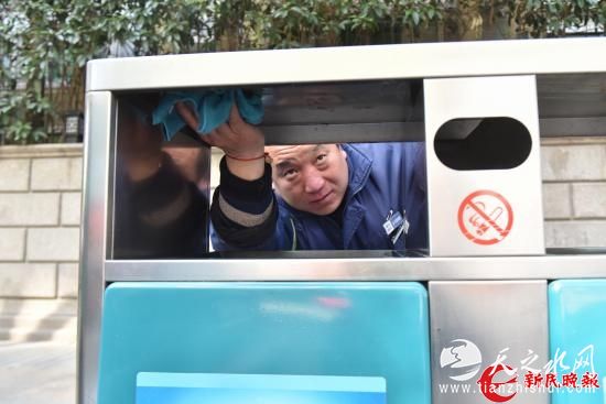图说:郑伟顺在擦洗废物箱新民晚报见习记者王凯摄