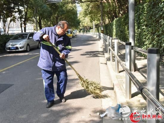 图说:环卫工人郑伟顺正在清扫街道新民晚报见习记者王凯摄