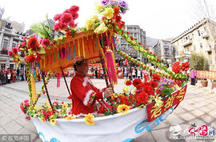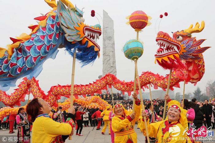 2018年2月16日,连云港市连云老街,民间艺人在表演舞龙。当日是农历大年初一,江苏连云港市连云老街举办“民俗踩街闹新春,红红火火过大年”活动,民间艺人为市民带来了摇花船、舞龙、跑驴、锣鼓、腰鼓、花篮舞、河蚌舞等精彩的民俗表演,在欢快、喜庆的气氛中红红火火过大年。
