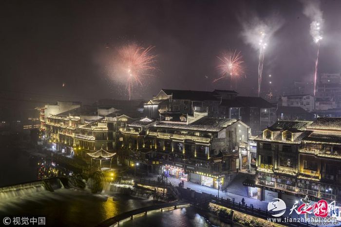 2018年2月16日零点始,湖南凤凰古城内家家户户燃放起了烟火,以此方式迎接农历新春。一时间古城内被轰鸣声与灿烂的烟花所包围。