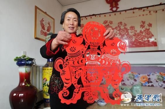 2018年2月2日,河北省黄骅市东常庄剪纸风情艺术小镇,“渤海渔村剪纸”非物质文化遗产代表性传承人韩宝菊在展示作品“金犬旺春”。(图片来源:新华社)