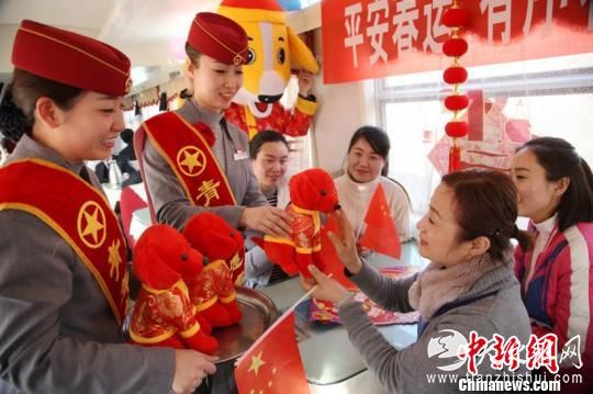 图为列车工作人员把祝福送给乘客。张强摄