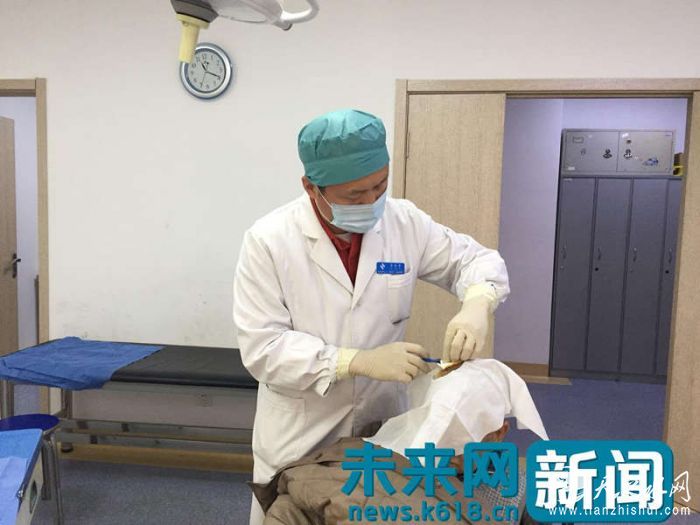 76岁的老先生头部蹭破了皮,在接受清创缝合术。(受访者供图)