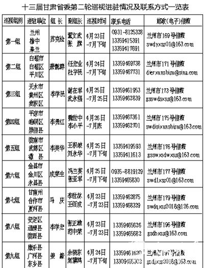中国甘肃网4月28日讯 据兰州晨报报道 (记者 梁峡林 实习生 黎霞) 4月27日,甘肃廉政网发布消息称,根据省委统一部署,十三届省委第二轮巡视进驻工作陆续结束。4月23日至26日,省委9个巡视组分别进驻兰州市、白银市、天水市、平凉市、陇南市、金昌市、甘南州7个市(州)及榆中县、皋兰县、白银区、平川区、秦州区、麦积区、崆峒区、崇信县、武都区、徽县、金川区、永昌县、合作市、夏河县、安定区、通渭县、陇西县、康乐县、广河县、东乡县等20个县(市、区)开展巡视。并公布了举报电话和邮政(电子)信箱。