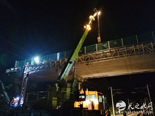 (记者 常魁星 通讯员 雒亚琴 冯承德)5月7日晚22:40封锁施工命令下达,在中铁武汉电气化局上海分公司合宁铁路防灾项目部沪蓉线12号桥施工现场,60余名施工人员迅速按照既定程序和操作规程开始了紧张作业,轨道车吊起十余吨重的硬横梁旋转、对位……。