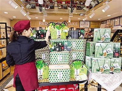 蛋糕店店员摆放粽子礼盒 欧阳海杰 摄