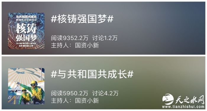 目前,由@国资小新 主持发起的#核铸强国梦#及#与共和国共成长#微博话题总阅读已达1.5亿,相关讨论微博5.4万条。
