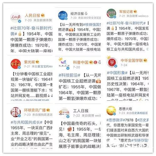 通过在微信、微博、网站、客户端、视频平台等全媒体平台的聚合推广,形成“大珠小珠落玉盘”的传播效果,#核铸强国梦#已成为许多网络大V和普通网民们自发参与的话题。