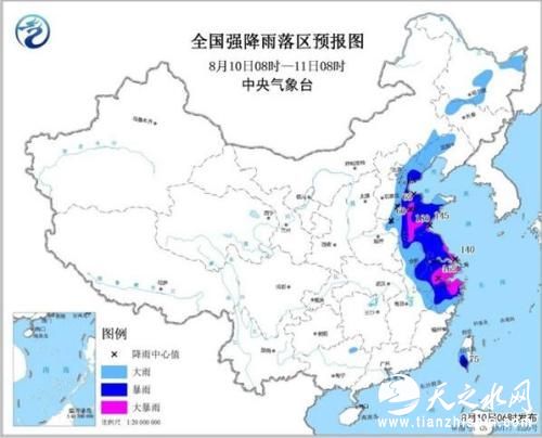 预计,8月10日08时至11日08时,浙江、上海、江苏、山东、安徽大部、台湾岛中南部以及河北东部、天津、辽宁西部、黑龙江中部等地的部分地区有大到暴雨,其中浙江中北部、上海、江苏东部和南部、安徽东南部、山东中部和东南部等地的部分地区有大暴雨(100~180毫米)。上述部分地区伴有短时强降水(最大小时降雨量20~50毫米,局地可达60毫米以上),局地有雷暴大风等强对流天气。