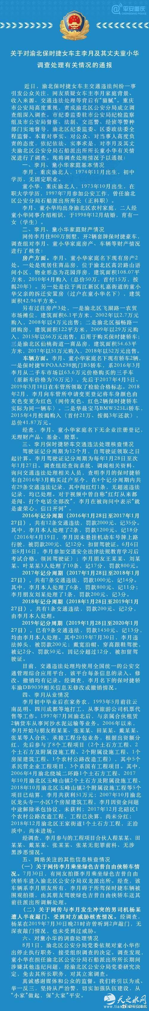 近日,渝北保时捷女车主交通违法纠纷一事引发公众关注,网友质疑女车主李月家庭背景、收入来源、交通违法处理等背后有“猫腻”。重庆市公安局高度重视,责成渝北区公安分局成立调查组深入调查。市纪委监委驻市公安局纪检监察组及市公安局督察、法制、交巡警、经侦等警种部门实地督导,渝北区纪委监委、区委政法委全程监督。本着对事实、对公众、对当事人高度负责的态度,依纪依法、实事求是,对李月及其丈夫渝北区公安分局石船派出所所长童小华有关情况进行了调查。现将调查处理情况予以通报: