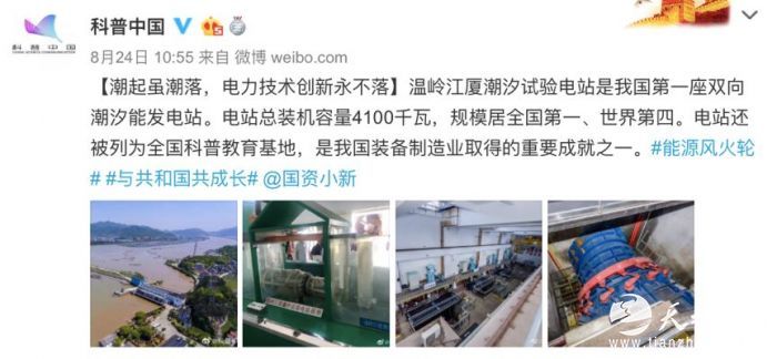 温岭江厦潮汐试验电站总装机容量4100千瓦,是目前我国最大、世界第四的潮汐能发电站。该电站的投产发电还作为发生在20世纪的世纪性大事,被镌刻在北京中华世纪坛的青铜甬道铭文中,备受瞩目。