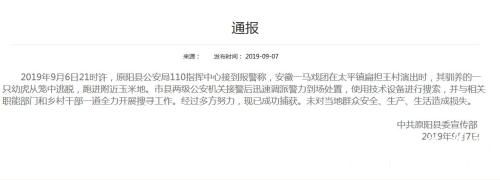 9月6日21时许,原阳县公安局110指挥中心接到报警称,安徽一马戏团在太平镇扁担王村演出时,其驯养的一只幼虎从笼中逃脱,跑进附近玉米地。