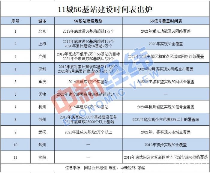 中新经纬客户端9月7日电(张猛)“5G”的脚步真的越来越近了,据中新经纬客户端不完全统计,北京、上海、广州、深圳、重庆、天津、杭州、苏州、武汉、郑州、沈阳等11城5G基站建设时间表出炉。