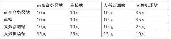 票价上,为满足不同人员的出行需求,运营方共制定4种票价。最受关注的普通单程票,20公里(含)以内10元,20公里到30公里(含)25元,30公里以后35元。照此计算,乘客从丽泽商务区站、草桥站出发,到大兴新城站、大兴机场站的票价分别为10元、35元。