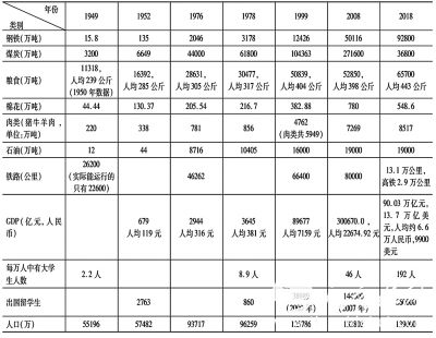 新中国70年发展成就领先于后发现代化国家立国70年的发展。新中国成立70年来的社会成就巨大。仅粮食一项而言,从1949年的1.13亿吨上升到2018年的6.57亿吨,70年间增加到原来的5.8倍,人均粮食产量增加了80%多。钢铁产量增加到原来的5850多倍、煤炭产量增加到100多倍、棉花产量增加到12倍。1947年,中国高校有207所,在校生155036人。2018年,全国普通高等学校和成人高等学校共计2663所,其中本科院校1245所,高职高专院校1418所,各种形式的在校生3833万人。1978年,中国的高等教育毛入学率只有1.55%,2018年达到48%。全国人均寿命由1949年的35岁增到2018年的77岁。