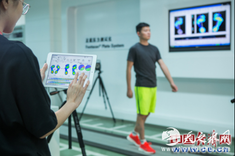 研发人员在仪器上做脚型数据收集采纳。(安踏集团供图)