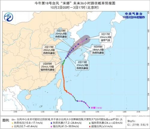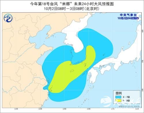 受“米娜”影响,10月2日8时至3日8时,东海北部、杭州湾、长江口区、黄海中部和南部、浙江北部沿海、上海沿海、江苏中南部沿海将有6~7级大风,其中,浙江北部沿海、东海北部、黄海东南部的部分海域或地区的风力有8~9级,阵风10~11级。中央气象台10月2日06时发布台风蓝色预警。