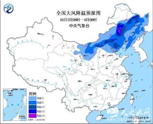 预计,10月2日8时至4日8时,内蒙古大部、黑龙江大部、吉林、辽宁、河北中北部、北京、天津、宁夏北部气温将下降6~10℃,局地12℃以上,新疆东部、内蒙古中西部、黑龙江西部、吉林西部、辽宁西部等地将出现4~6级偏北风,阵风可达7~8级(见图1)。中央气象台10月2日06时继续发布大风降温预报。