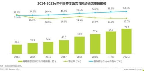 艾瑞咨询发布的《2019年中国网络婚恋交友行业研究报告》中显示,2018年中国网络婚恋交友行业市场营收为49.9亿元,预计到2021年网络婚恋市场将保持稳定增长总营收超70亿,在整体婚恋市场中的渗透率将进一步提升。此外,网络婚恋企业正向婚庆、婚姻咨询、金融等业务拓展。