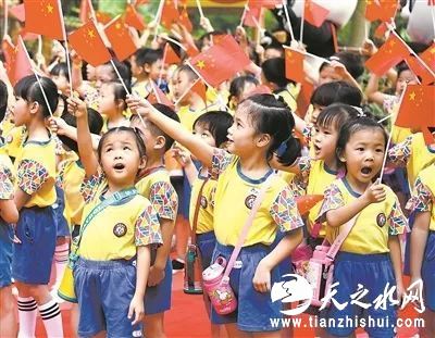 2019年9月27日,广州小朋友挥舞国旗歌唱祖国。新华社记者 刘大伟 摄