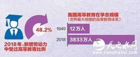在中国共产党的坚强领导下,经过几代教育工作者的不懈奋斗,全体人民的思想道德素质和科学文化素质全面提升。我国用20多年时间走完了发达国家上百年的义务教育普及之路,用十几年时间实现了高等教育从大众化向普及化的快速发展。2018年,我国劳动年龄人口平均受教育年限达到10.6年,新增劳动力中受过高等教育的比例超过48.2%,平均受教育年限达到13.6年以上,高于世界平均水平。