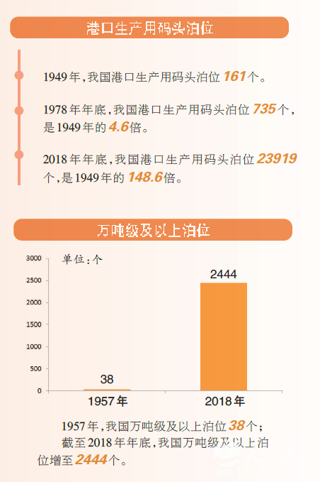 目前,我国亿吨级大港数量达34个,万吨级及以上泊位2444个,形成了环渤海、长三角、东南沿海、珠三角和西南沿海5个港口群,90%以上的外贸货物通过港口进出。2018年,全国港口货物吞吐量完成143.51亿吨,约为新中国成立初期的1430倍。