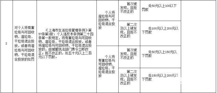《上海市生活垃圾管理条例》行政处罚裁量基准显示,个人将湿垃圾与可回收物、干垃圾混合投放,首次被发现,且拒不改正的处50元以上100以下罚款;第二次及以上被发现,且拒不改正的,处100元以上200元以下罚款。