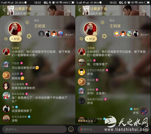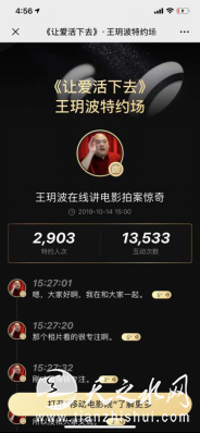 2019年10月14日,移动电影院【让爱活下去 王玥波特约场】圆满结束。截止本次特约场结束,已有2903人进行特约,形成13533次互动。本次特约场不仅是曲艺之花的一次别样绽放,更是传统曲艺与现代科技的一次有机碰撞。据悉,本次特约场观影人群中以曲艺粉居多,其中仅来自相声之乡天津的评书粉、相声粉就占据了特约场人数的半数之多,他们纷纷表示足不出户就可以现场“听到王玥波”十分激动。