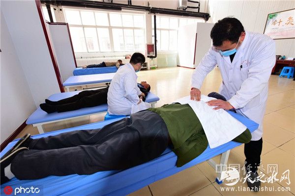 2018年4月10日,山东省潍坊青州市实行“以养融医”模式的安康养老中心的医生为老人们康复按摩。(图片来源:东方IC)