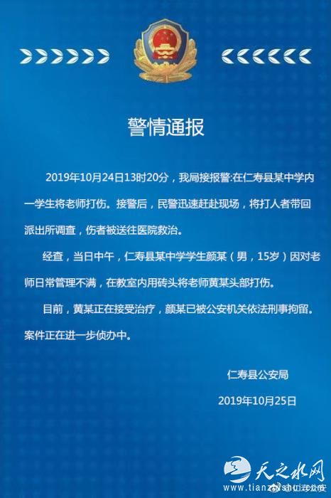 通报称,2019年10月24日13时20分,仁寿县公安局接报警:在仁寿县某中学内一学生将老师打伤。接警后,民警迅速赶赴现场,将打人者带回派出所调查,伤者被送往医院救治。