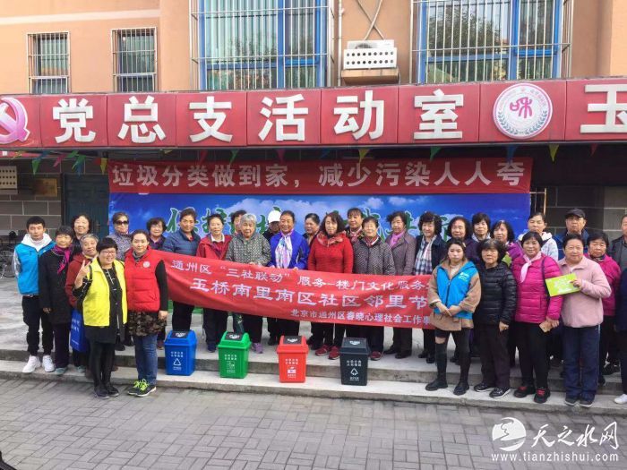 (记者 常魁星)10月26日,北京市“社区邻里节”在通州区运河广场隆重开幕,全区各街道社区纷纷开展了丰富多彩的“邻里节”活动。下午2点,北京市通州区民政局“三社联动”服务楼门文化服务项目之一的玉桥南里南区“垃圾分类,呵护绿色家园”垃圾分类宣传活动和“志愿服务打造绿色家园”捡拾垃圾活动相继展开。北京市通州区春晓心理社会工作事务所社工、北京环境卫生工程有限公司人员、社区领导及志愿者120人参加了活动。