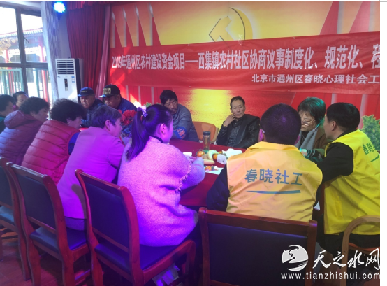 (记者 常魁星 通讯员 宋天天)11月17日,北京市通州区西集镇社会事务管理科与北京市通州区春晓心理社会工作事务所携手,在西集镇太平庄村开展了议事协商活动,太平庄村村委会代表、居民代表、社区社会组织主要成员等参加了此次活动。