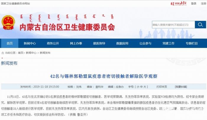 11月18日,42名与在北京确诊的2名肺鼠疫患者的锡林郭勒盟密切接触者,医学观察期满,无发热等异常表现,实验室PCR检测均为阴性,经专家会商研究,解除医学观察。目前还有4名密切接触者继续医学观察,无发热等异常表现。来自锡林郭勒盟镶黄旗的腺鼠疫患者仍在化德县医院隔离救治,该患者的密切接触者28人继续进行医学观察,目前无发热等异常表现,区内无新发病例。自治区卫生健康委将继续按照自治区党委、政府安排部署,落实好疫情防控各项工作任务和医疗救治,切实做到依法科学防控。(鲁亚开)