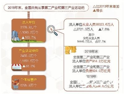 普查报告显示,2018年末,全国共有从事第二产业和第三产业活动的法人单位2178.9万个,产业活动单位2455.0万个,个体经营户6295.9万个。2018年末,全国第二产业和第三产业法人单位从业人员38323.6万人,比2013年末增加2721.3万人,增长7.6%。其中,第二产业的从业人员为17255.8万人,减少2005.0万人,下降10.4%;第三产业的从业人员为21067.7万人,增加4726.2万人,增长28.9%。