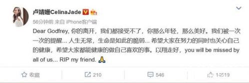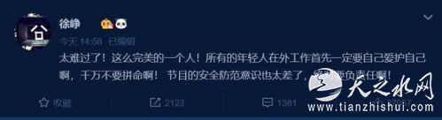 徐峥直言,“太难过了!这么完美的一个人!所有的年轻人在外工作首先一定要自己爱护自己啊,千万不要拼命啊! 节目的安全防范意识也太差了,绝对要负责任啊! ” 英国演员杰米·坎贝尔·鲍尔发图悼念高以翔,他发了俩人当年的合影,表示“心碎”,他们曾经在2013年电影《圣杯神器:骸骨之城》里合作,还一起现身过SDCC漫展宣传该片。