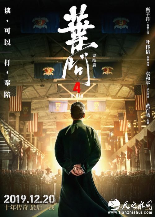 电影《叶问4》由博纳影业集团、东方影业出品,北京博纳影业集团有限公司、上海天马联合影视文化有限公司、天津猫眼微影文化传媒有限公司、万达影视传媒有限公司、太阳娱乐文化有限公司、耳东文化(北京)有限公司、复星影业、上海鸣肇影视文化有限公司、佛山东天影视文化有限公司、天马影联影视文化(北京)有限公司、博纳影视娱乐有限公司联合出品。甄子丹、吴樾、吴建豪、斯科特·阿金斯(Scott Adkins)领衔主演,郑则士、陈国坤、敖嘉年、高战(Chris Collins)主演,李宛妲特别出演,将于12月20日在全国上映。