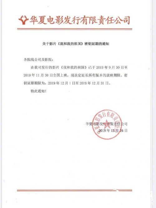 近日,电影《我和我的祖国》再次宣布密钥延期,密钥延期期限为2019年12月1日至12月31日。《我和我的祖国》于9月30日上映,首次密钥延期后,上映时间延长至11月30日,此次是第二次延长上映时间。