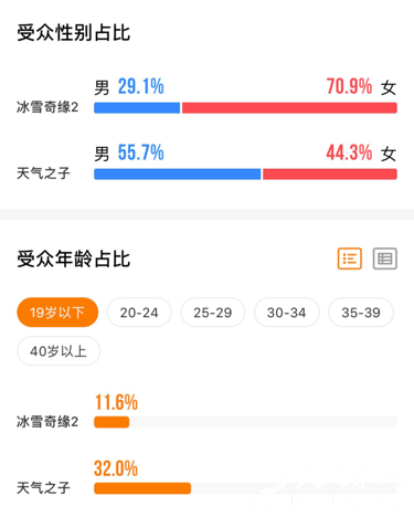 虽然都是动画电影,《冰雪奇缘2》和《天气之子》的受众群却非常不同。《冰雪奇缘2》更符合成人女性关注的口味,《天气之子》则更适合那些喜欢二次元文化的年轻人。