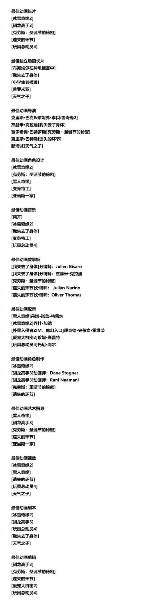 《冰雪奇缘2》《驯龙高手3》《克劳斯:圣诞节的秘密》《遗失的环节》《玩具总动员4》入围最佳动画长片,《布努埃尔在神龟迷宫中》《我失去了身体》《小学生老板娘》《普罗米亚》《天气之子》获最佳独立动画长片提名。