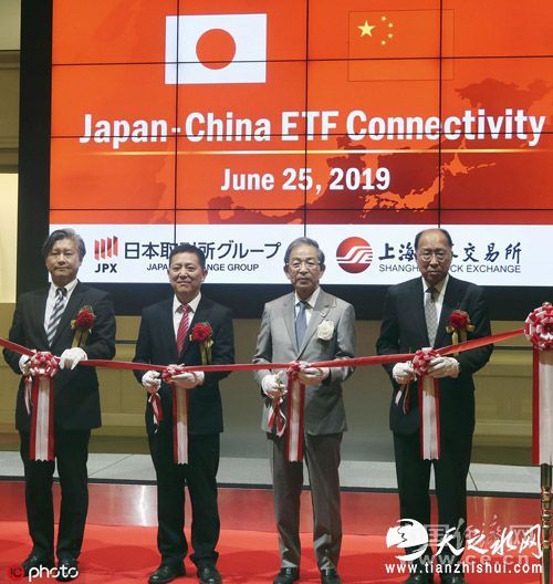 6月25日,上海证券交易所和日本交易所集团分别举行中日ETF互通开通仪式,4只中日ETF互通产品在上交所成功上市。图为日本交易所集团首席执行官Akira Kiyota(右二)出席东京证券交易所剪彩仪式。(图片来源:东方IC)