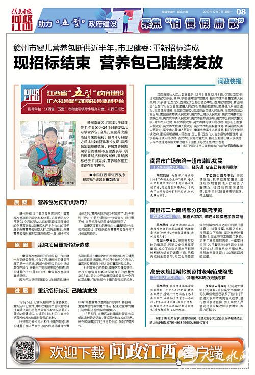 儿童营养改善项目的招标采购工作由赣州市卫健委负责。今年7月,赣州市卫健委开展了第一次招标,因部分投标公司对中标结果存在异议,经赣州市财政局采购办核查,市卫健委已于11月19日对儿童营养改善项目重新招标。