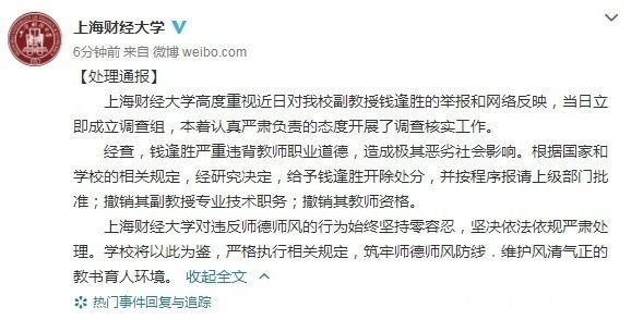 上海财经大学高度重视近日对我校副教授钱逢胜的举报和网络反映,当日立即成立调查组,本着认真严肃负责的态度开展了调查核实工作。