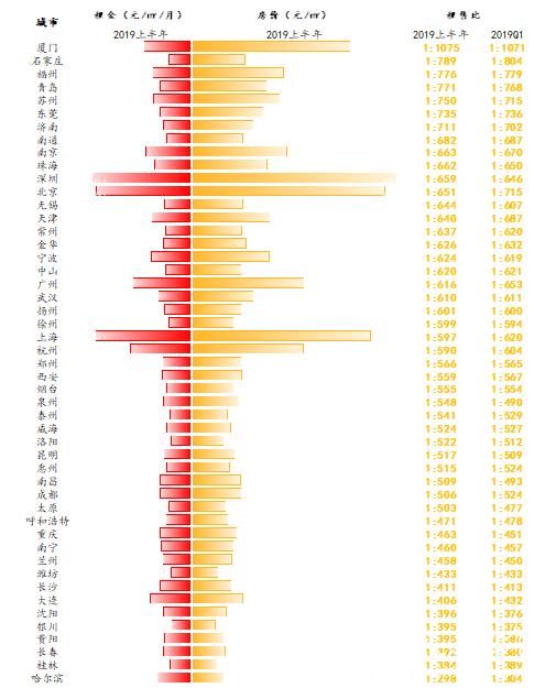 1∶300~1∶200,这是国际上用来衡量一个区域房产运行状况良好的租售比。而今年上半年,我国50个重点城市的租售比仅为1:592,远低于国际合理租售比区间水平。