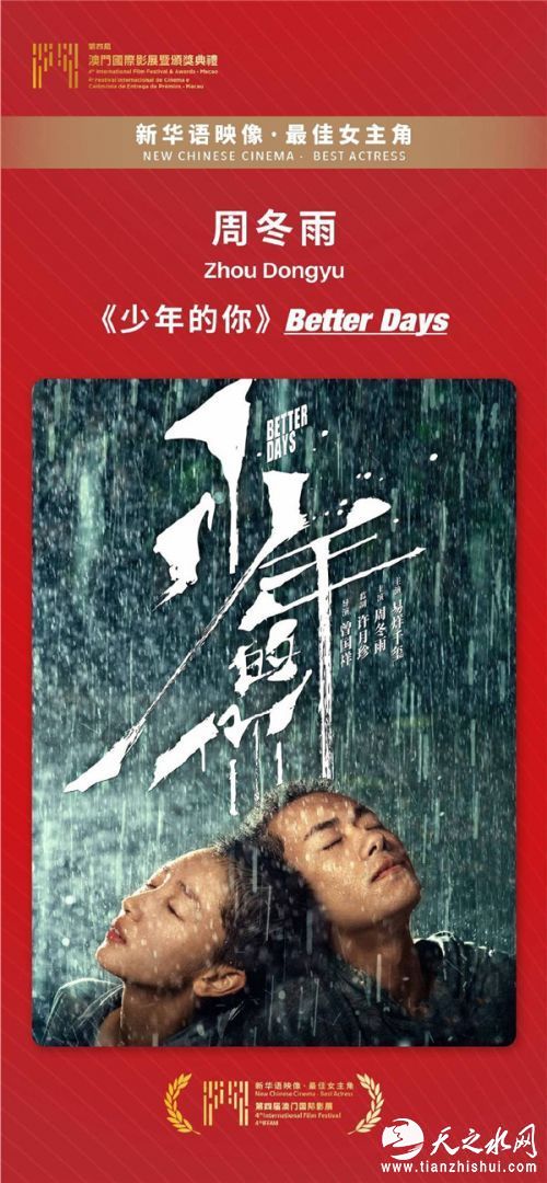 周冬雨凭借《少年的你》获得“新华语映像”单元最佳女主角 图片来源:澳门国际影展