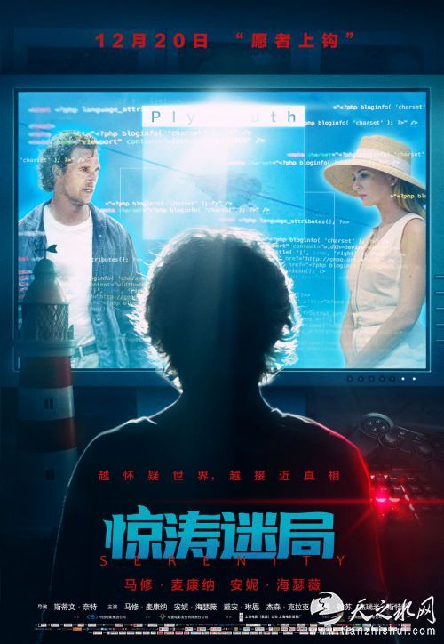 在此次发布的终极海报中,安妮·海瑟薇与马修·麦康纳似乎置身一台电脑显示器中,两人身后是一片大海与小岛交织出的蔚蓝,看似静谧的背景画面中,却隐约可见一串又一串的“诡异代码”布满屏幕,令人感到匪夷所思的同时,又像是在向观众传达某种隐藏的“秘密信息”。而占据了整张海报中央的巨大 “神秘人影”则似乎在静静观望着面前电脑屏幕中所发生的一切……