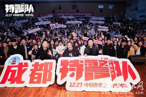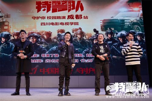 同日,导演丁晟携主演贾乃亮、刘俊孝来到成都,走进四川大学锦城学院、四川电影电视学院,参加校园路演活动。导演现场表示,《特警队》是自己“最硬”的一部作品,不仅类型硬核,视效、演员都“硬”气十足。两位主演也分享了拍摄感想,贾乃亮表示“魔鬼训练”太累了,要一直咬牙坚持,被丁晟导演现场“威胁”要告诉特警指导,惹得贾乃亮连声讨饶。刘俊孝表示拍摄间隙大家都在训练,每个人都随身携带速效救心丸,丁晟导演眼睛发炎依然守在监视器前,主创的专业和敬业感动了台下同学,掌声阵阵不息。难得回到母校四川电影电视学院的刘俊孝,现场真情流露“有回到学生时代的感觉”,更是和贾乃亮在同学们的欢呼声中大秀“花式俯卧撑”,引爆全场氛围。