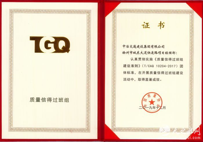 12月22日,中冶交通收到来自中国质量协会的荣誉证书,徐州项目部获得产品质量方面在班组级别的全国最高荣誉——全国质量信得过班组。