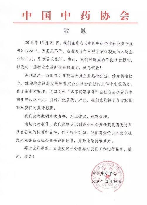 昨晚,中国中药协会通过官网发布致歉函称,2019年12月21日,该协会在发布《中国中药企业社会责任报告》过程中,因把关不严,在表彰环节出现了争议较大的入选企业和个人,引发公众批评。“我们决定撤销本次表彰,纠正错误,规范管理。”(12月27日《北京青年报》)