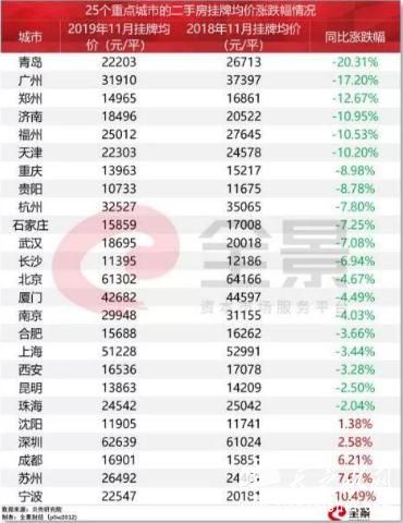 全景财经引用贝壳研究院的数据显示,与去年相比,全国多个城市二手房挂牌均价下跌幅度较为明显。过去一年(2018年11月到2019年11月),25个重点城市有20个城市的挂牌均价出现下跌,甚至有城市的跌幅超过20%。